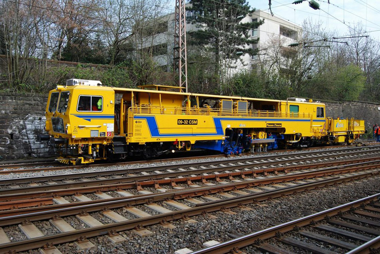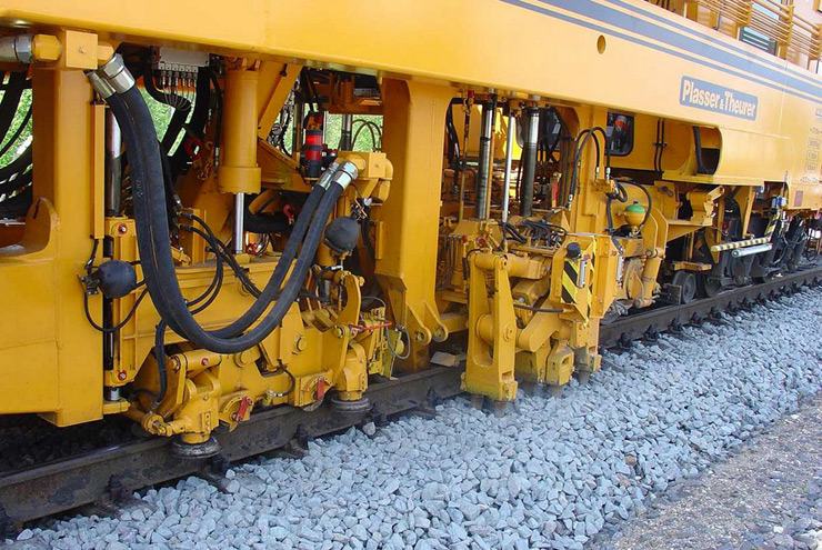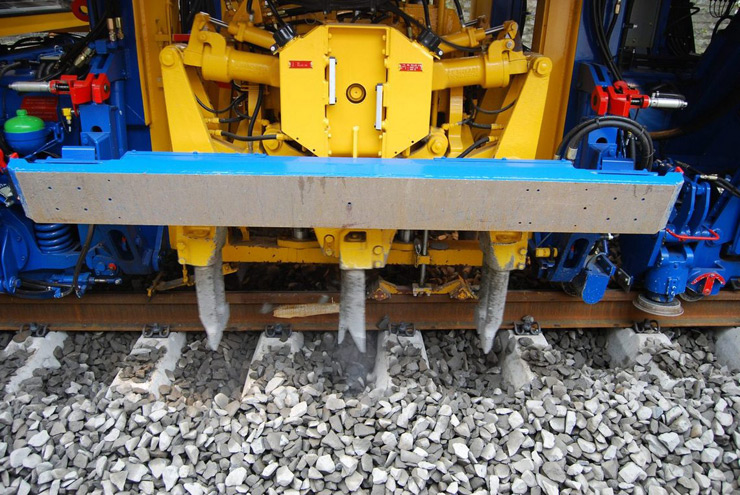 Bateadora, niveladora y alineadora de trabajo continuo de dos traviesas para línea con vagón estabilizador integrado