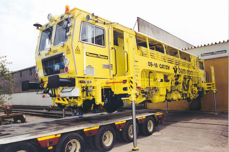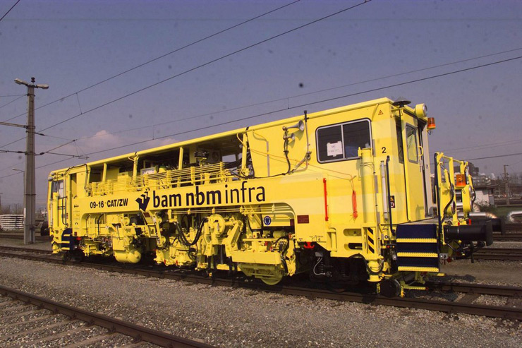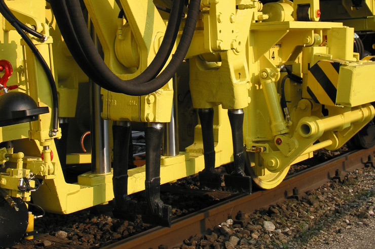 Bateadora, niveladora y alineadora de trabajo continuo de una traviesa para línea, autocargable a una góndola