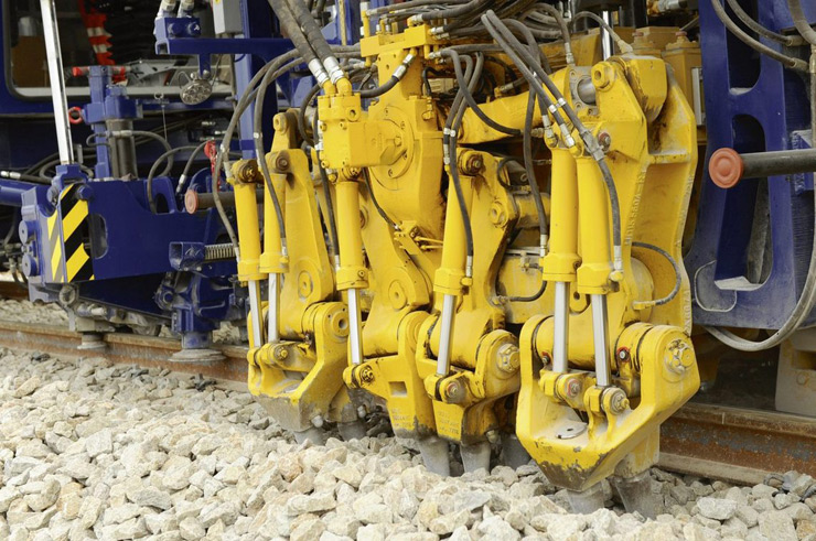 Bateadora, niveladora y alineadora de trabajo continuo de una o dos traviesas para línea y cambios con levante de 3 hilos y bateo de 4 hilos
