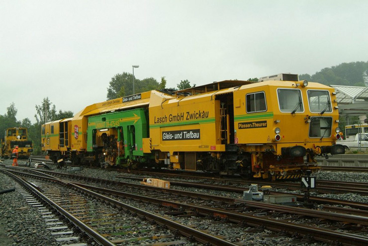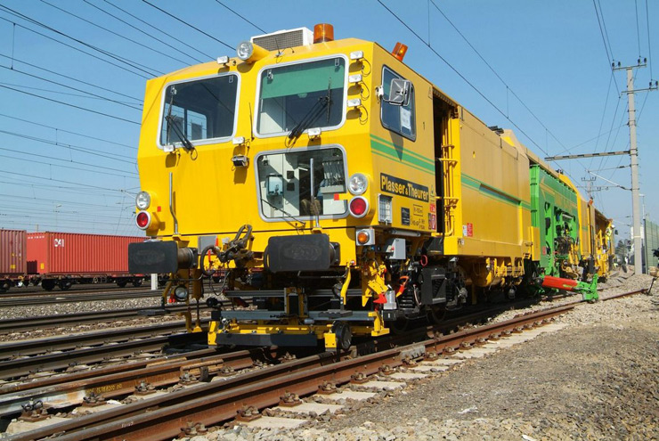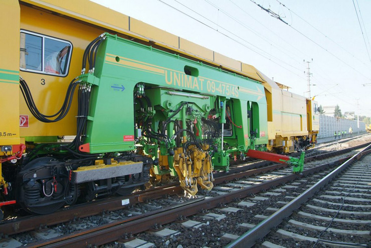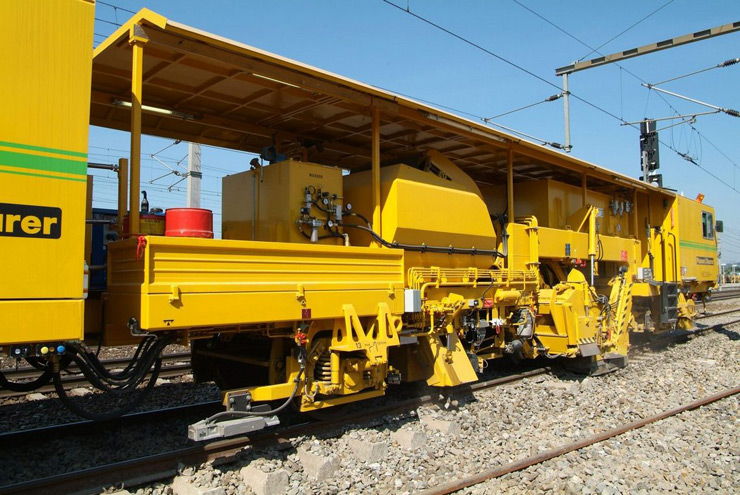 Bateadora, niveladora y alineadora de trabajo continuo de una traviesa para línea y cambios con levante de 3 hilos y bateo de 4 hilos