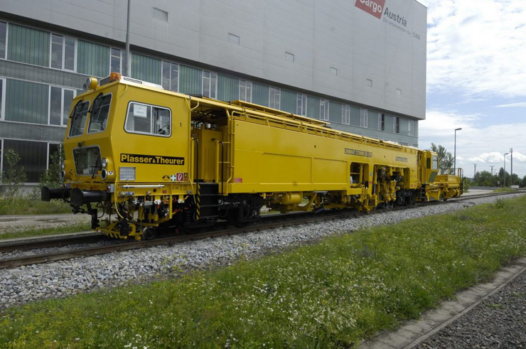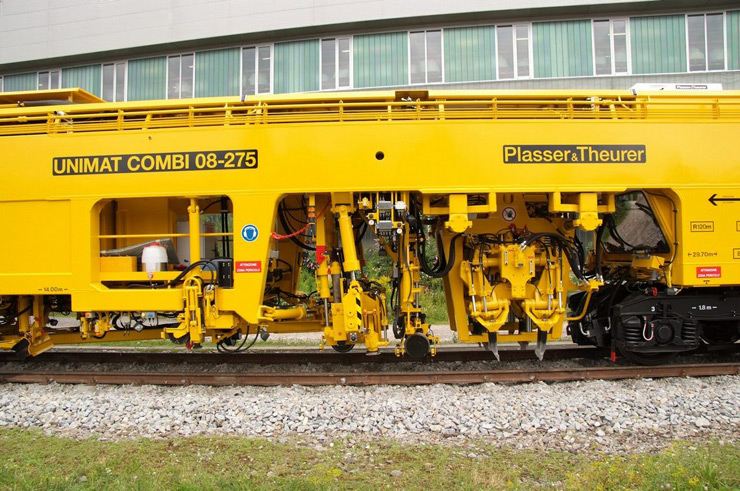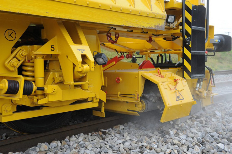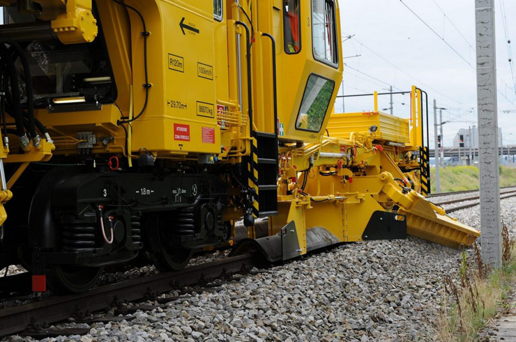 Bateadora, niveladora y alineadora de trabajo cíclico de una traviesa para línea y cambios con levante de 3 hilos y vagón de perfilado y barrido de balasto integrado