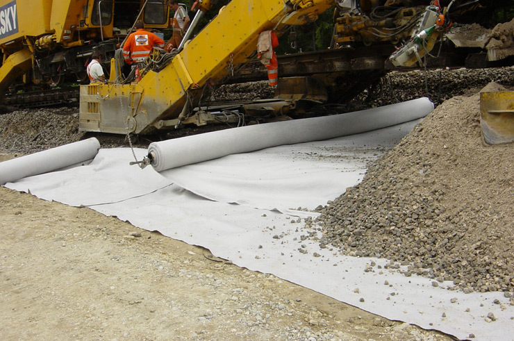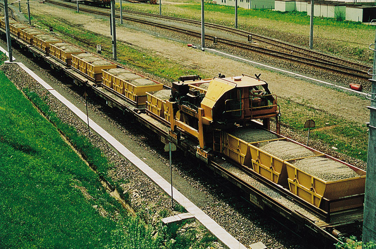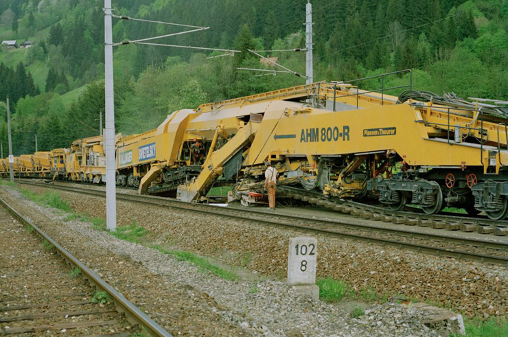 Máquina para la conservación de la plataforma para línea, con dos cadenas de excavación y reciclaje de material integrado. La colocación del balasto nuevo se realiza en un ciclo de trabajo posterior