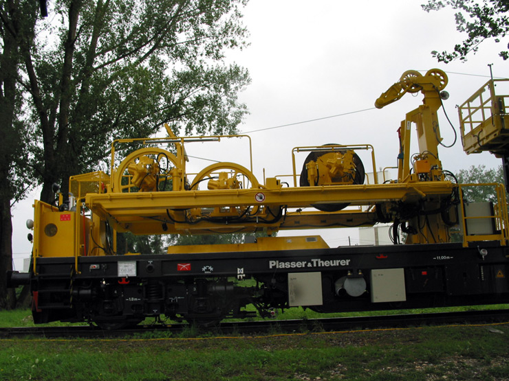 Máquina de trabajo continuo para la construcción y la renovación de catenaria, con tendido del hilo de contacto o del cable sustentador con tensión final y trayectoria en zig-zag