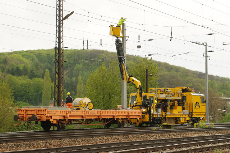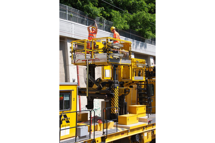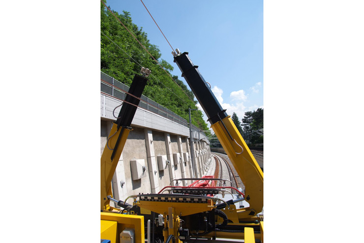 Dresina pesada de inspección y montaje con plataforma elevadora de columnas de tres particiones y grúa con cesta de trabajo
