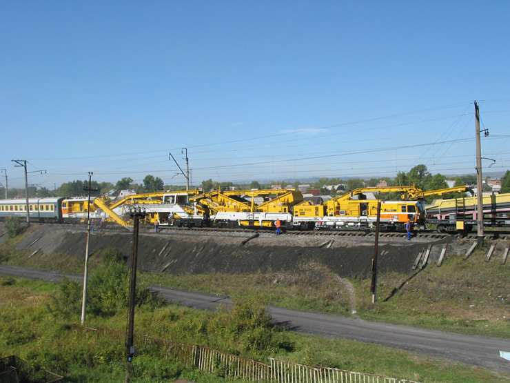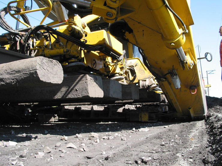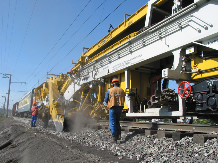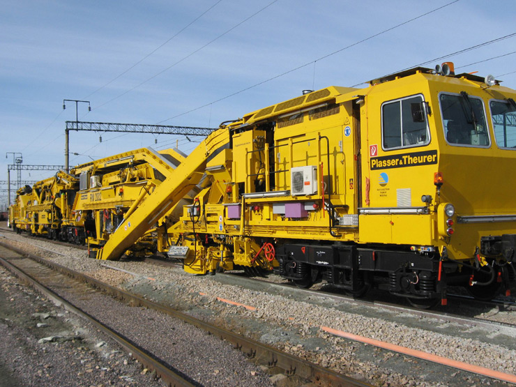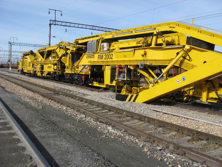 Máquina depuradora-desguarnecedora de balasto de alto rendimiento para línea, con una cadena de excavación y dos dispositivos de cribado