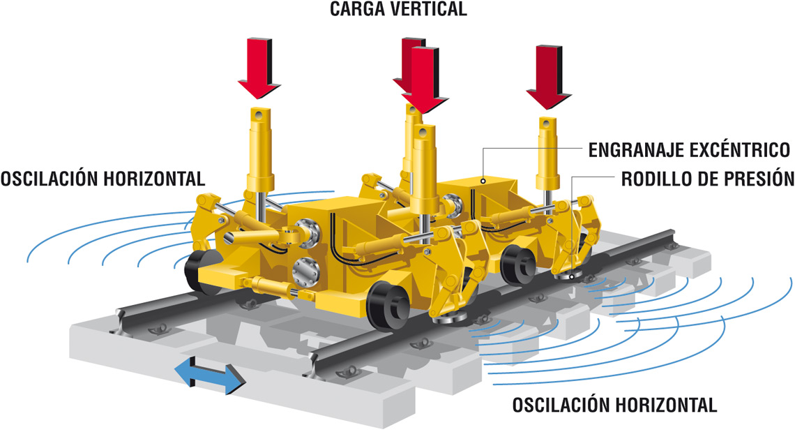 Los grupos de estabilización se presionan firmemente contra ambos carriles. Vibradores de masas excéntricas generan una vibración horizontal en dirección transversal a la vía. Esta vibración se transmite a la banqueta y provoca que las piedras de balasto se reordenen, prácticamente sin esfuerzo, en una estructura más compacta. El asentamiento del emparrillado resultante se controla a través de la carga vertical. La estabilización dinámica de vía realiza los asentamientos iniciales necesarios de manera dirigida y controlada. La reserva de calidad de la vía aumenta, la posición de la vía es más duradera. Además se eleva la resistencia lateral.