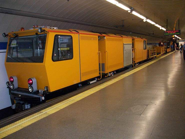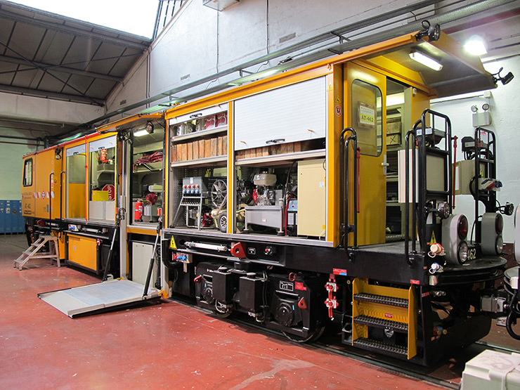 Máquina auxiliar de vía apta para el almacén y transporte de personal y mercancías. Cuenta con plataformas para facilitar la carga y descarga de materiales.