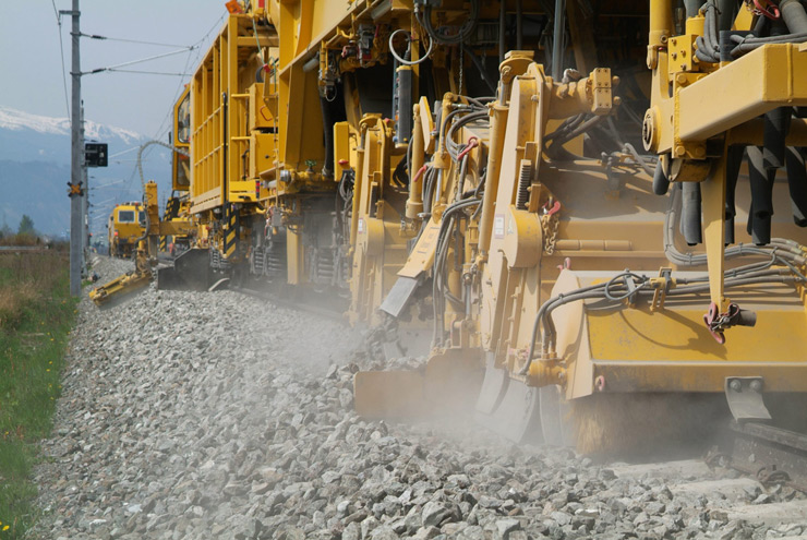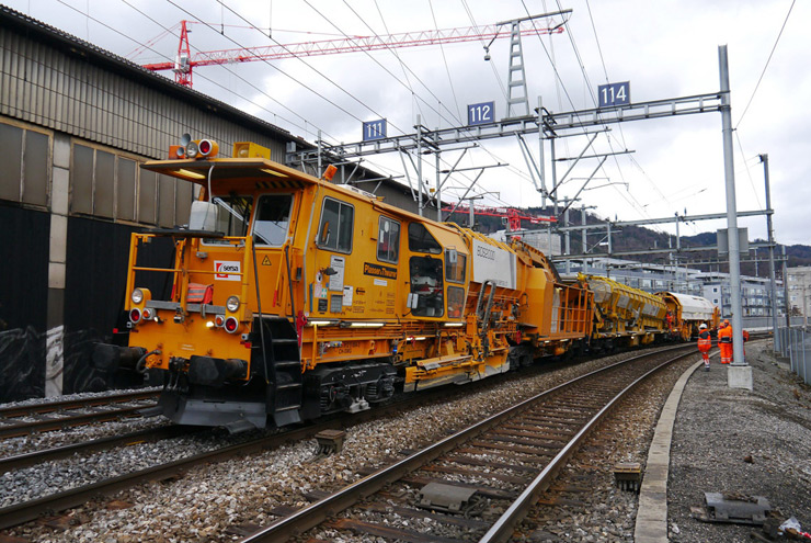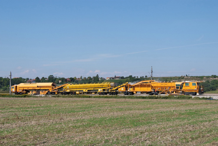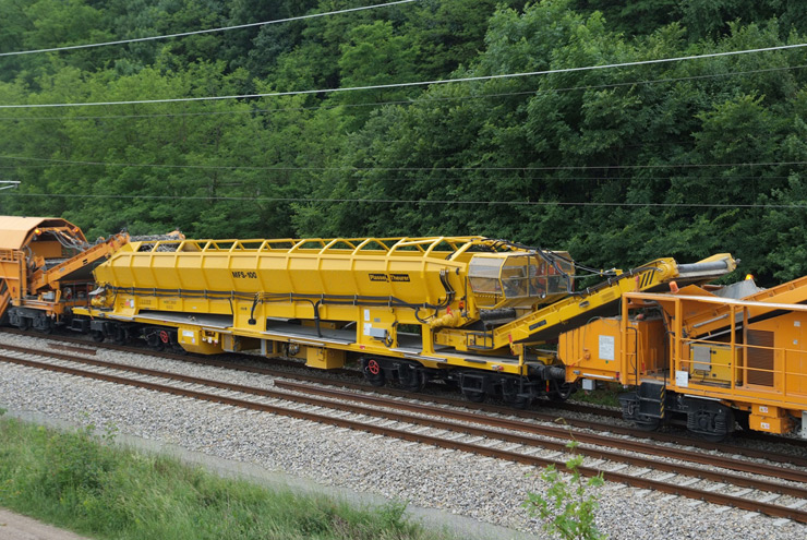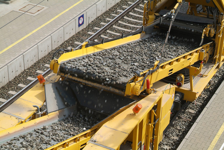 Sistema para la gestión de balasto para línea y cambios, compuesto de una unidad de arado con arados laterales, arado central, así como una tolva de balasto de 15 m³ con cinta transportadora de fondo de tolva (capacidad de almacenamiento de balasto ampliable mediante unidades MFS) y una unidad de recogida de balasto con dos dispositivos de barrido