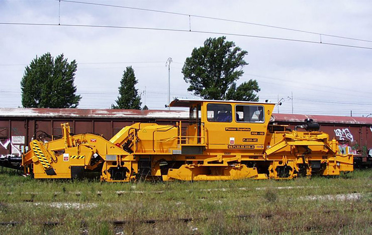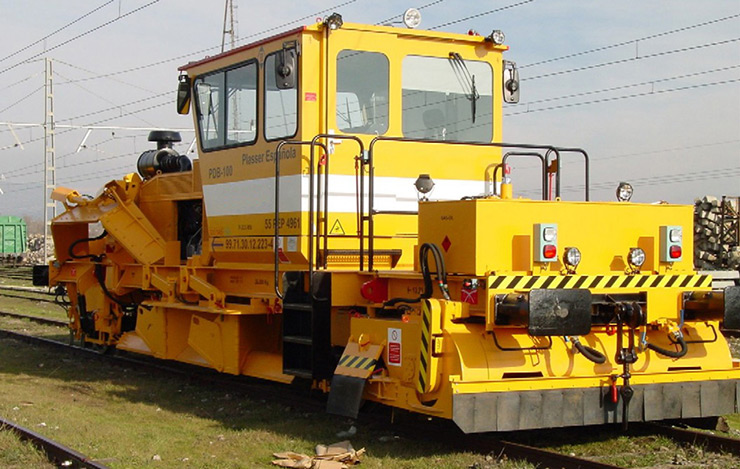 Reguladora y perfiladora de balasto de dos ejes con propulsión hidrostática. Adecuada para movimientos de grandes cantidades de balasto, ya que cuenta con dos tipos de arado central: uno enterizo y otro partido. Permite realizar los trabajos de regulación de balasto en ambos sentidos y en cambios de vía.