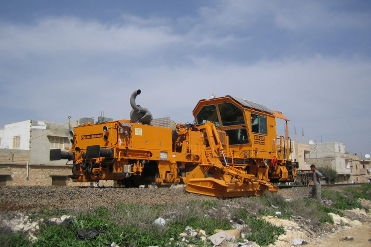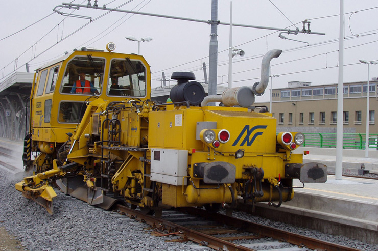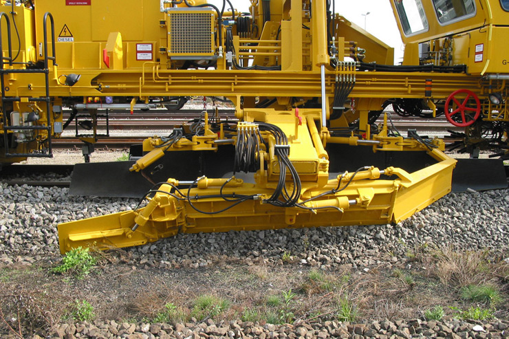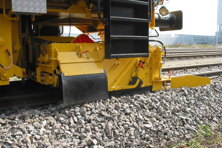 Reguladora y perfiladora de balasto para línea, con arados laterales, arado central y dispositivo de barrido con cinta transportadora transversal