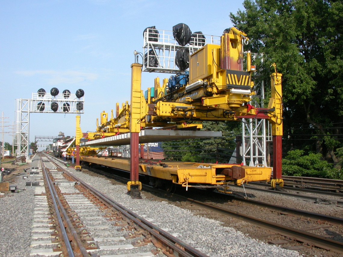 En el caso del transporte y la colocación mecanizados de cambios puede haber múltiples escenarios de manipulación: cambios completos o elementos del cambio premontados. De la carga y descarga, el desplazamiento lateral hasta la vía y también del transporte longitudinal sobre la vía y en la obra se encarga directamente la máquina de renovación de cambios. Así queda garantizado, que la precisa geometría del cambio premontado se mantenga hasta su colocación. Porque esta calidad inicial es decisiva para la durabilidad del cambio.