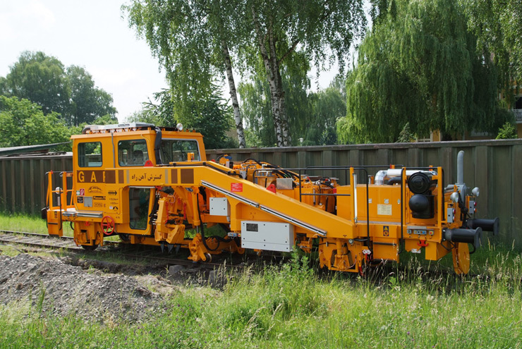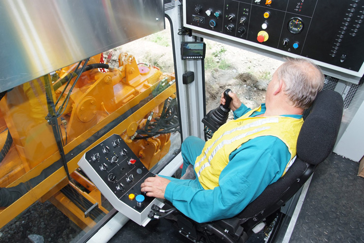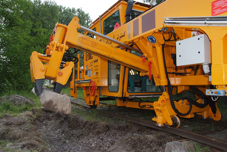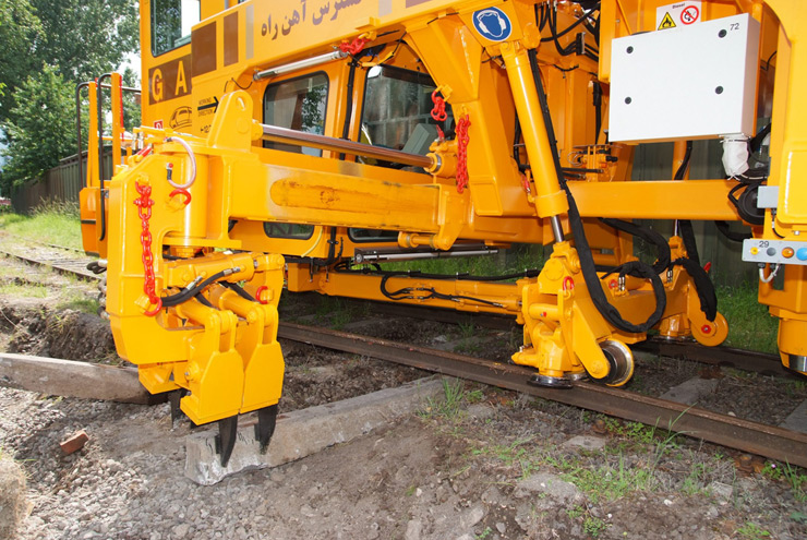 Máquina de trabajo cíclico para el montaje y desmontaje de traviesas individuales, con dispositivo de levante de carriles