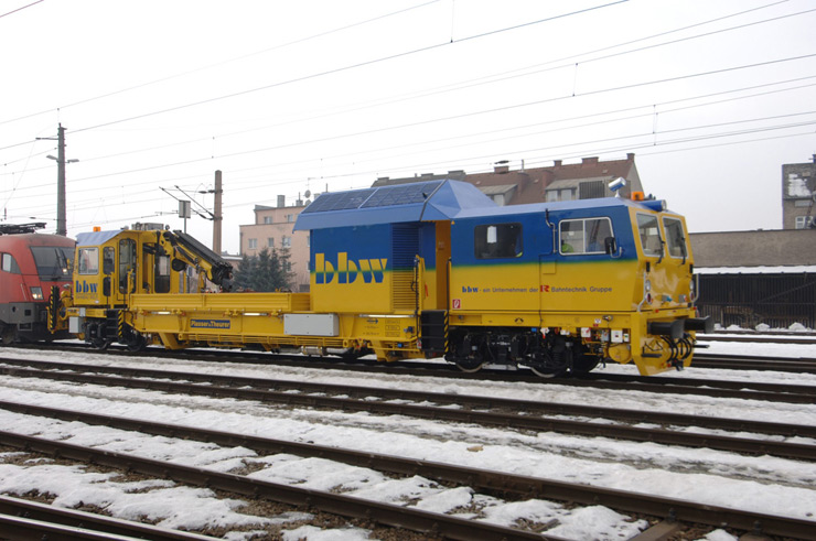 Vehiculo pesado de mantenimiento de superestructura con plataforma de carga y grúa especial con cesta de trabajo, apto también para inspeccionar puentes